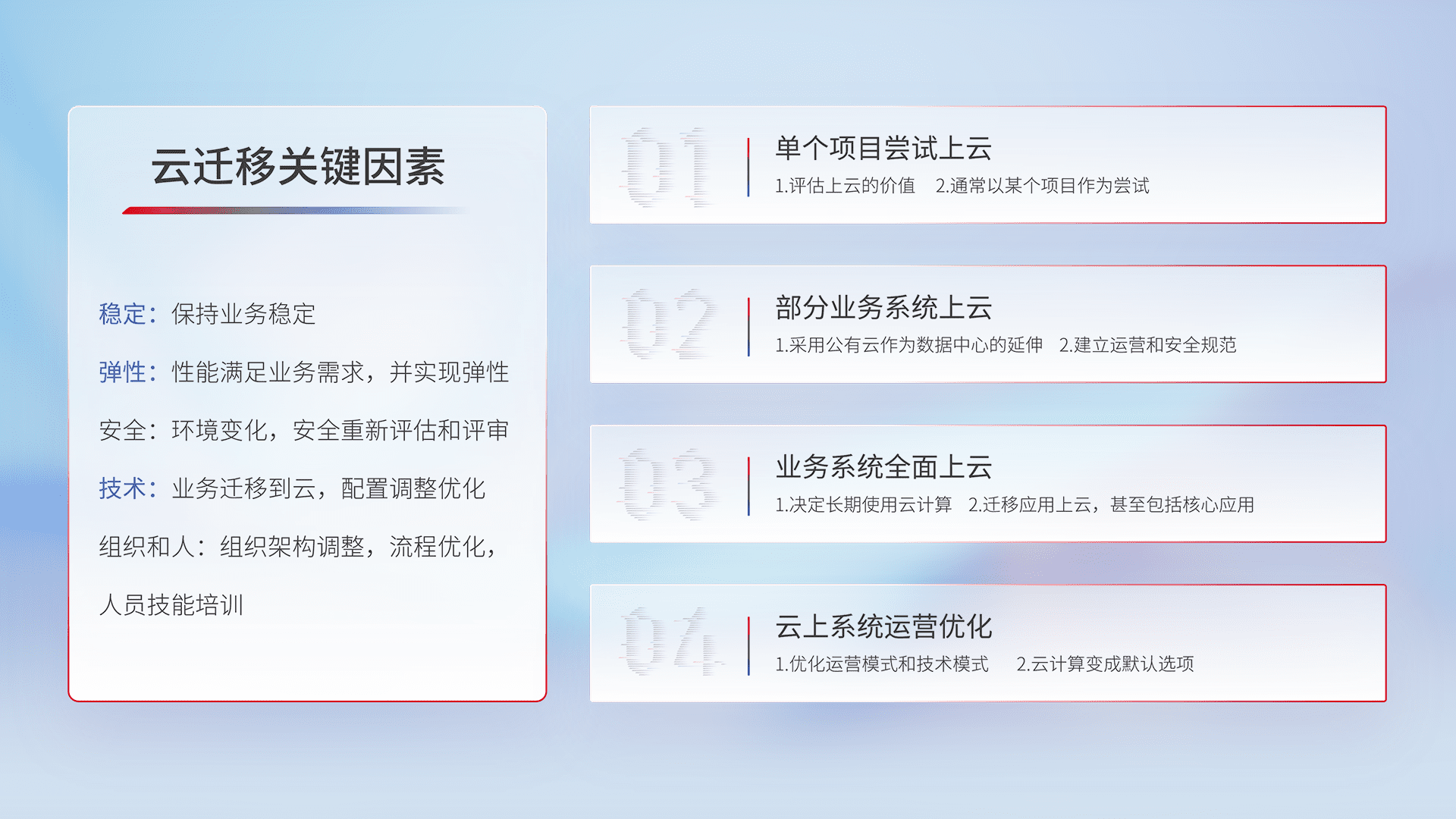 结合实际业务,,,,从规划设计、、、、云平台选型、、、、云原生改造、、、数据迁移、、、、集成交付,,,,迁移全过程为客户识别最佳上云路径,,做好风险识别管理,,,,设计网络架构、、、、身份权限、、、、安全审计合规、、、操作审计、、、日志审计、、、、监控告警策略、、、、多站点容灾设计等,,对云上基础设施进行整体规划,,,,提升IT治理水平,,以满足弹性、、、高可用、、、、高性能的需求。。
