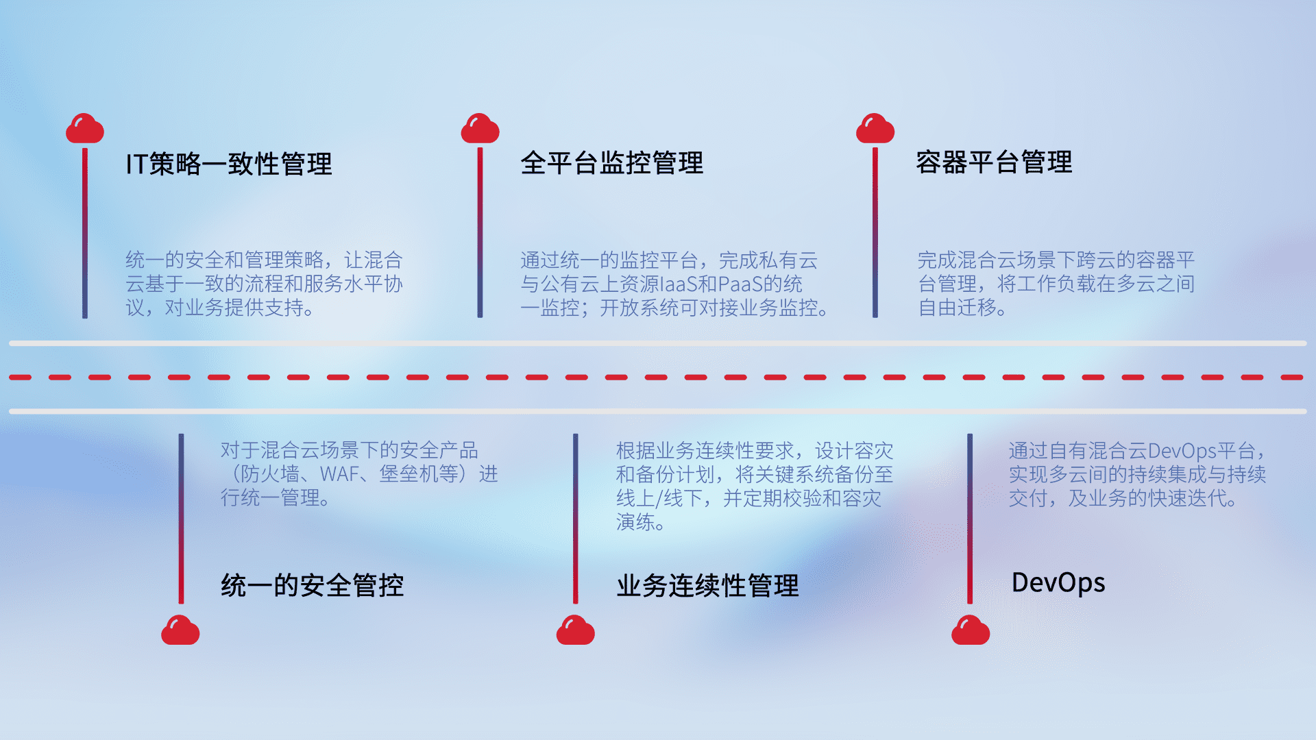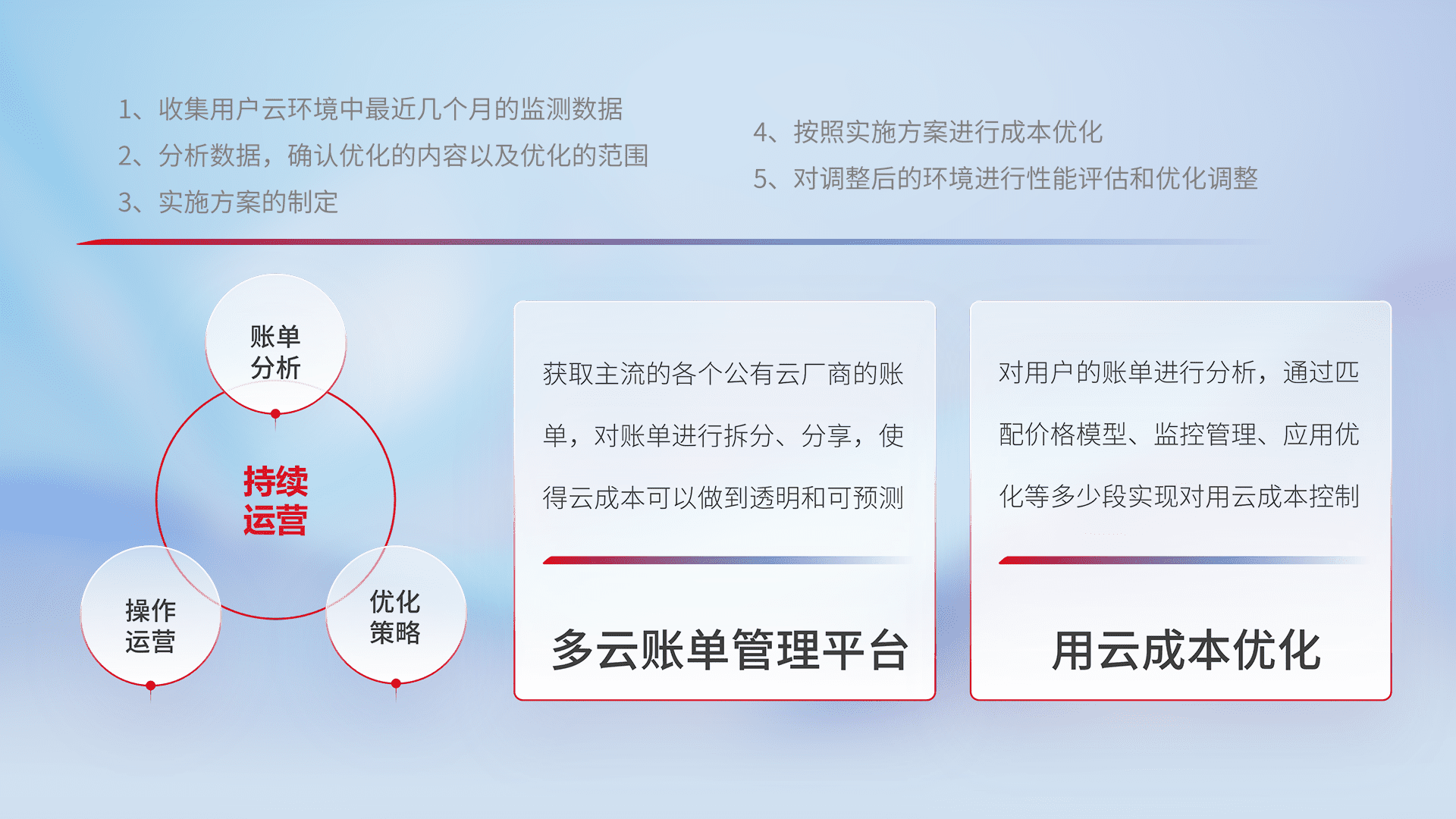 通过多云纳管,,以统一的资源数据模型把客户的云资源进行抽象和封装,,,进而实现对多云资源的统一操作,,,保障云资源管理的可靠性、、、、稳定性与可用性。。。。量身定制化运维内容,,配置、、、、开发运维、、补丁管理、、、备份、、、、监控、、、认证和访问管理、、、、审计和日常巡检等,,,,保障在用云过程中的可靠度,,,,稳定度以及高可用率。。