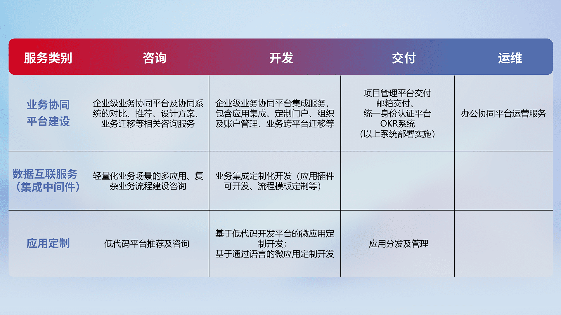 针对钉钉、、企微、、IDaas等平台级产品提供产品的规划、、方案、、、、交付、、定制化开发等服务,,,实现如统一协同办公、、、、智能客户服务、、、混合会议管理、、、、智能数据查询、、、等业务场景,,,,实现数字化转型。。。。